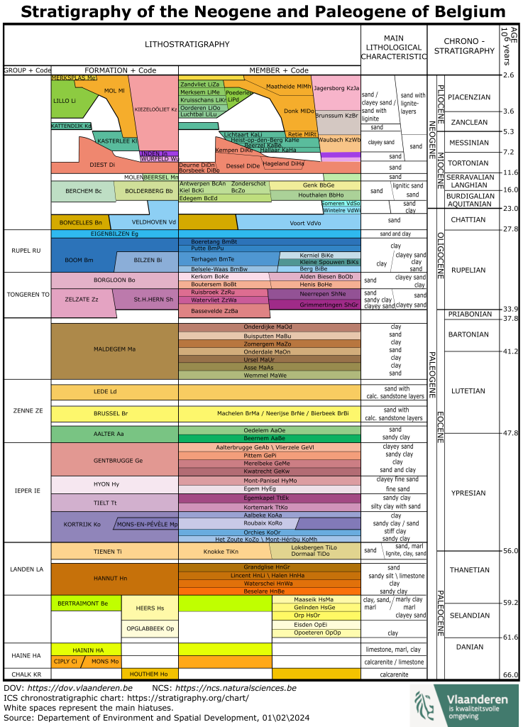 For many Paleogene lithostratigraphic units, major stratigraphic revisions were recently published, such as for the Ieper Group (Steurbaut et al., 2017), the Rupel Group (Vandenberghe & Wouters, 2024) and the Brussels Formation (Houthuys et al., 2023).